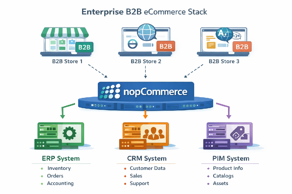 nopCommerce is enterprise-ready for B2B when you use customer roles and ACL permissions to control who sees what, apply tier/role-based pricing for wholesale logic, run multiple storefronts from one installation, and integrate with back-office systems (ERP/CRM/PIM). Add proper caching, hosting, and monitoring, and you get a scalable B2B channel that can grow without replatforming.